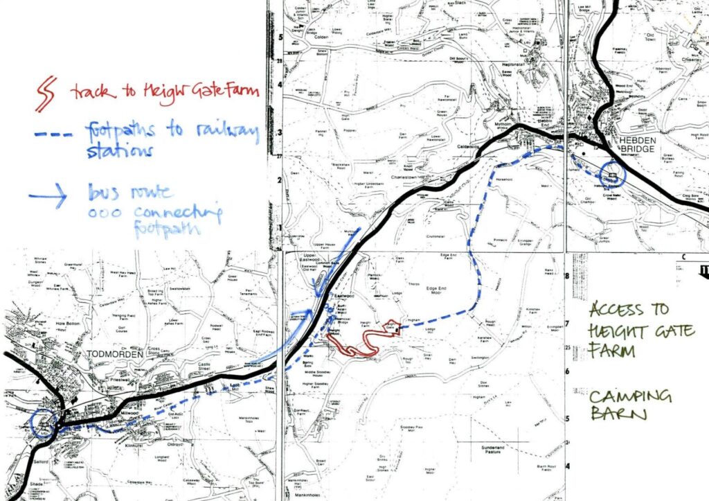 Height Gate is situated up a winding track off the main road (A646 Halifax Road) between Todmorden and Hebden Bridge. We encourage guests to use public transport where possible, then walk up to Height Gate. If driving we strongly encourage car sharing and keeping the number of vehicles going on the track to a minimum. Vehicles can be left at the valley bottom in the large layby on the main A646, 125m towards Hebden Bridge from the turning off to Height Gate.