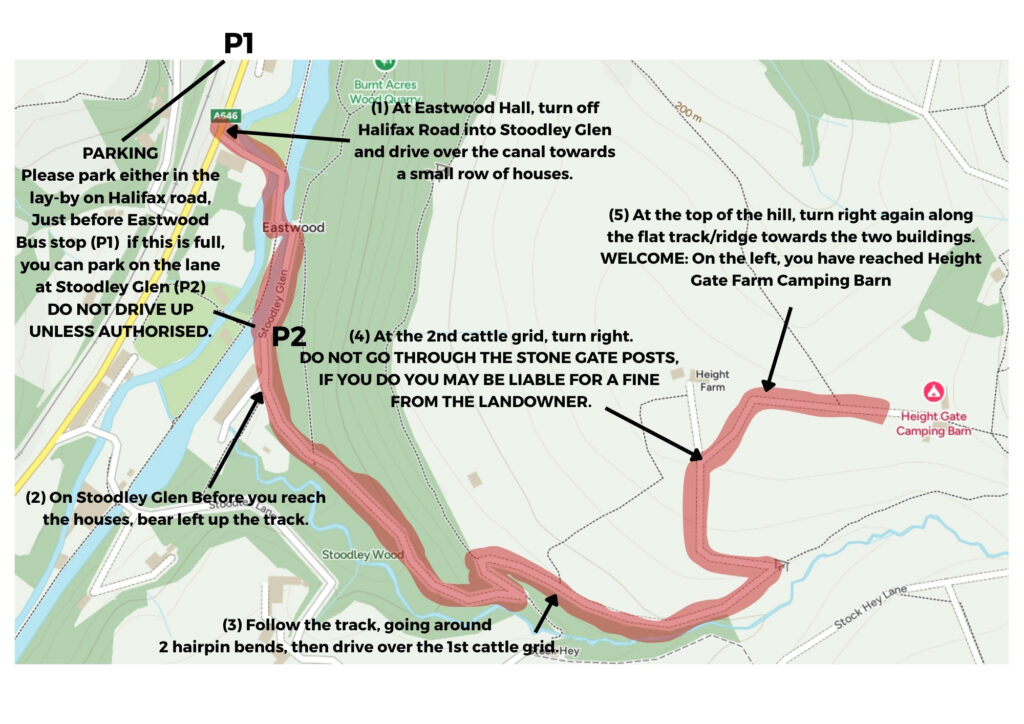 Turn off the A646 at Stoodley Glen, follow the road over the bridge that goes across the canal. Follow the road until you get to the houses, from there take the track on the left instead of following the road to the houses. When coming up the track go straight over the first cattle grid. When you get to second cattle go over it and immediately take the right hand fork in the lane. Do not enter the large stone gates with ‘Height Farm’ on. Keep right and please continue down the track until the end and Height Gate camping Barn will be on your left.
